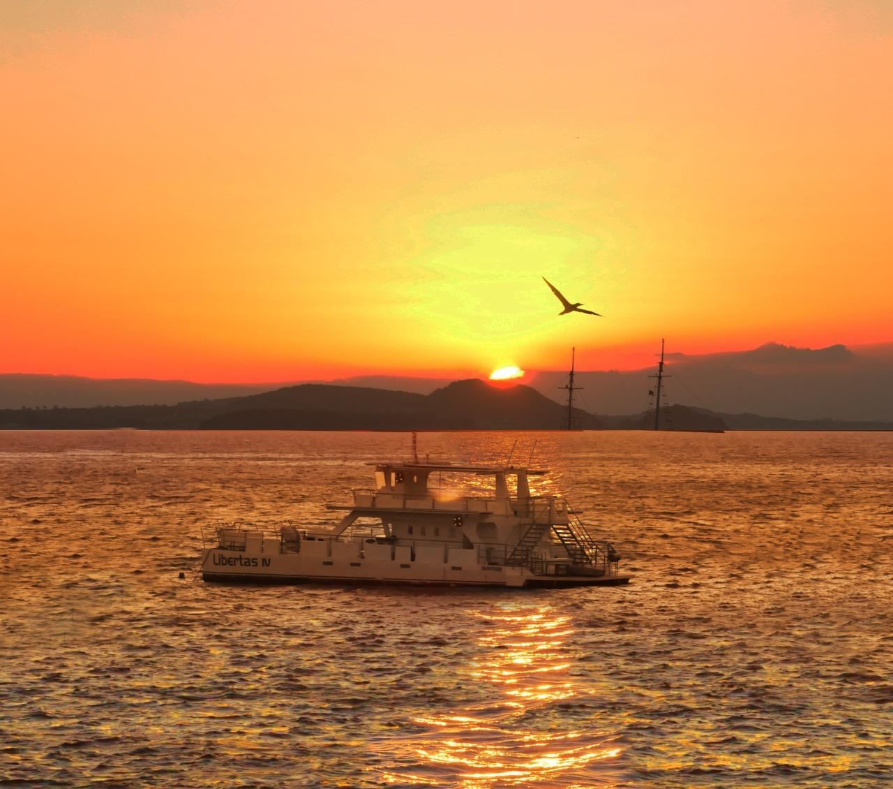 Nosso Catamarã Libertas IV, possui 2 andares, 4 banheiros, pista de dança, bar e muito mais.